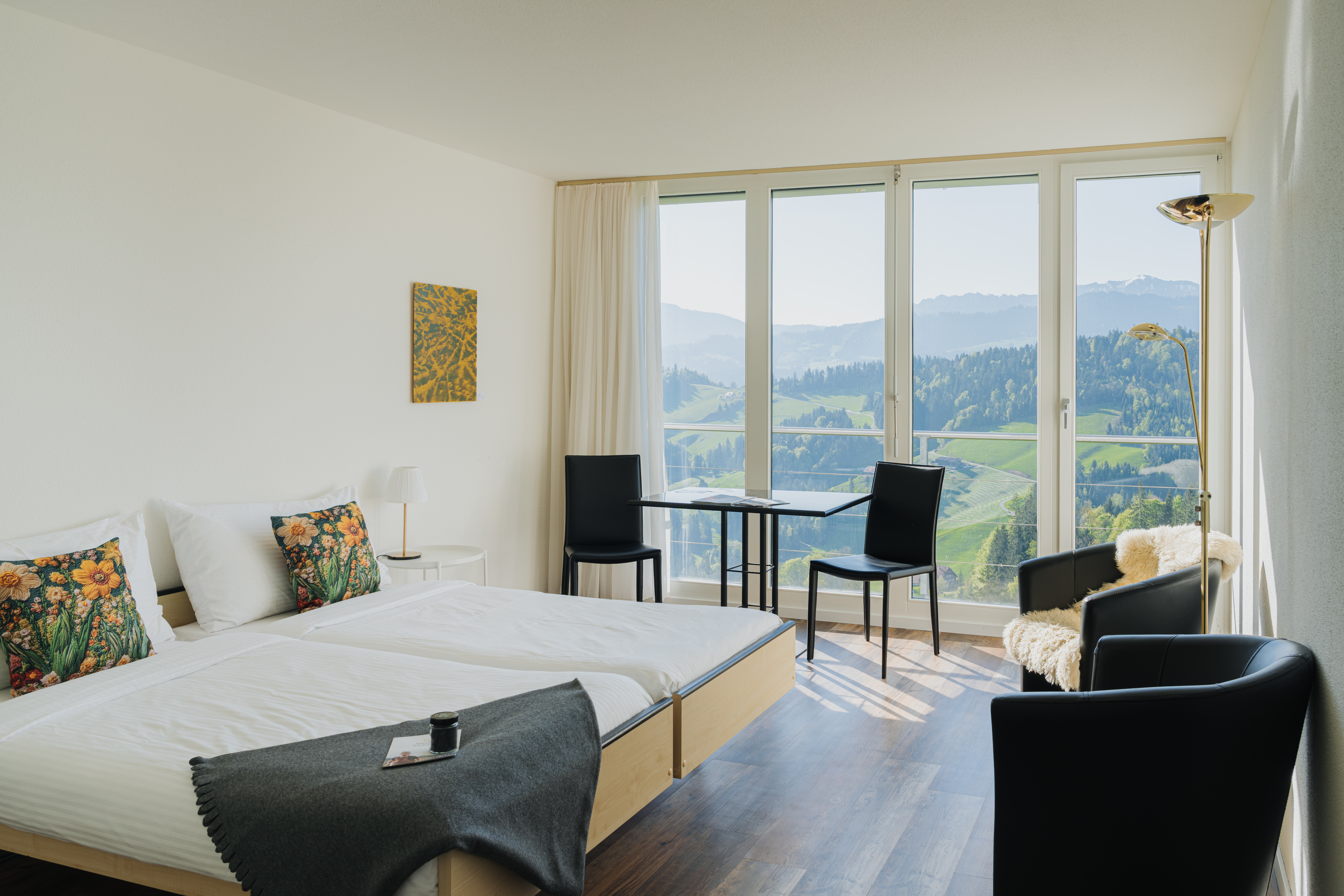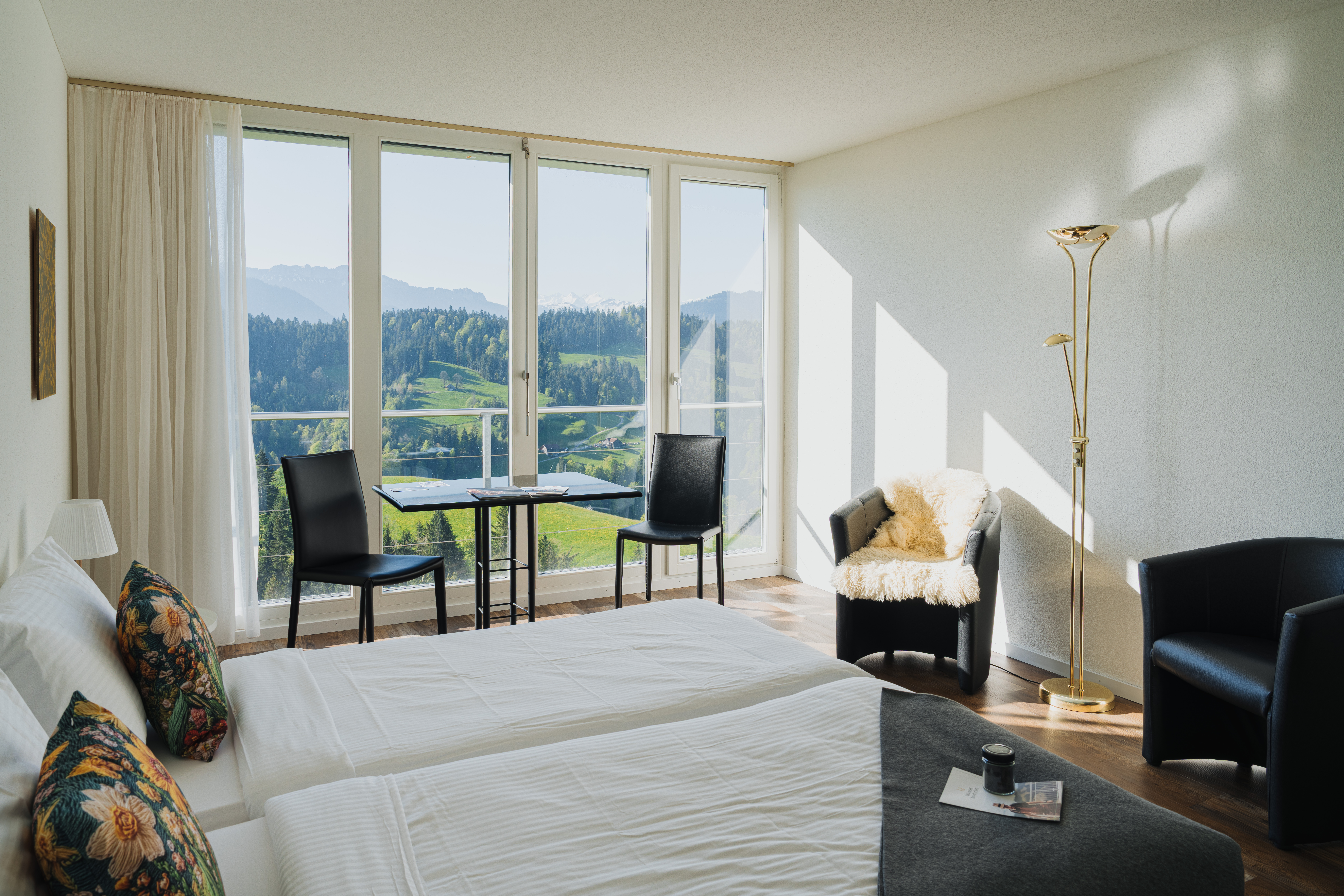 Die große Fensterfront bringt viel Licht und bietet eine freie Sicht auf die umliegenden Berge. Die geräumigen Zimmer bieten ausreichend Platz, um sich wohl und behaglich zu fühlen. Sie sind mit Twin-Betten, einer Sitzecke und einem Schrank ausgestattet. Das Badezimmer verfügt über eine Dusche, WC und Haarföhn. Alle Zimmer sind mit dem Aufzug erreichbar.